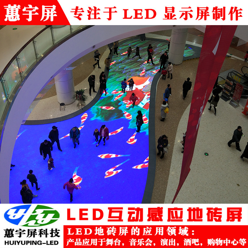 互動(dòng)地磚屏是在LED地磚屏基礎(chǔ)之上,增加了感應(yīng)互動(dòng)功能。LED地磚顯示屏里面裝載有壓力傳感器或電容式傳感器或紅外傳感器等設(shè)備,當(dāng)人在地磚屏上移動(dòng)時(shí),傳感器能感應(yīng)到人的位置并將觸發(fā)信息反饋給主控制器,然后主控制器邏輯判斷后輸出相應(yīng)的顯示效果。